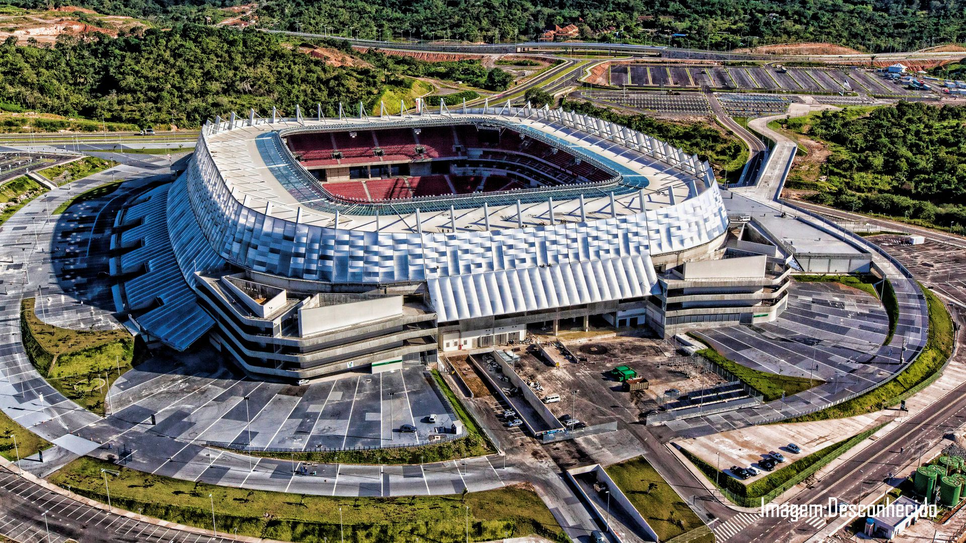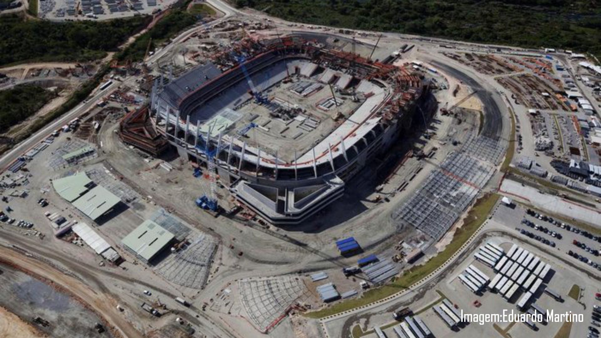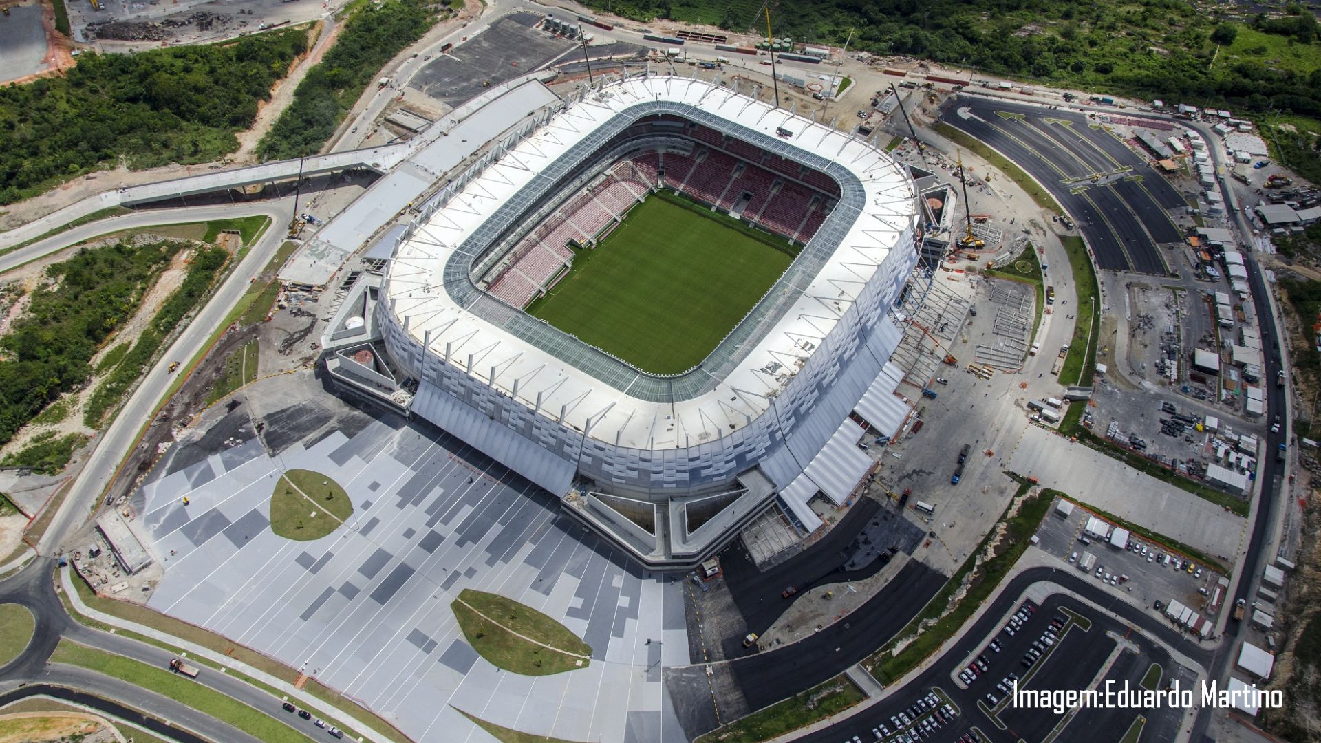 2. A cobertura da arena foi executada com aço importado da Espanha, tendo sido escolhida por sua estética e eficiência de prazo. A estrutura em aço foi fixada sobre 68 pilares metálicos nas alas sul e leste, sustentando 22 módulos montados previamente no solo com telhas, forros e vidros. Esses módulos foram içados por um guindaste de 400 toneladas para a instalação final; e