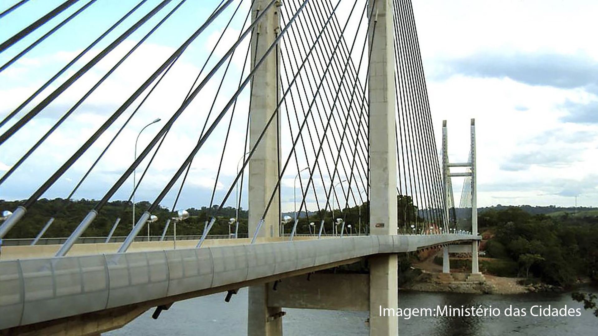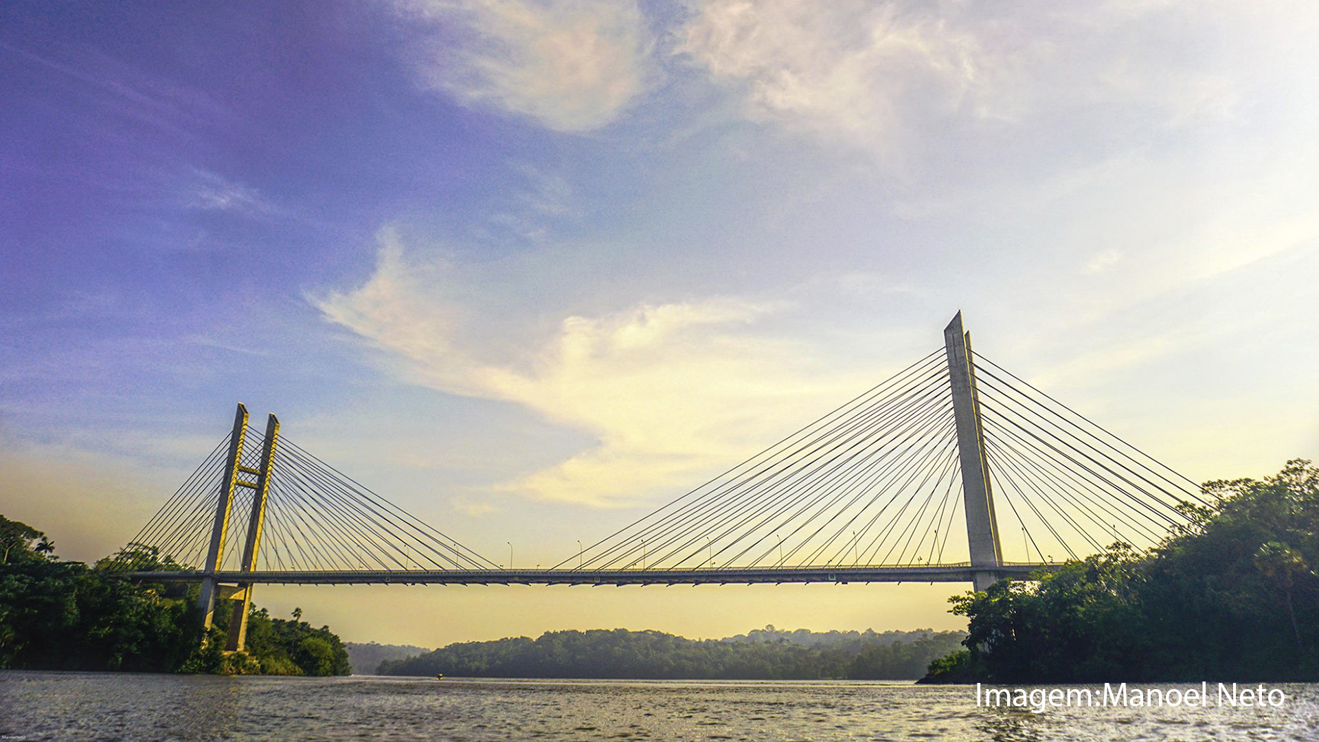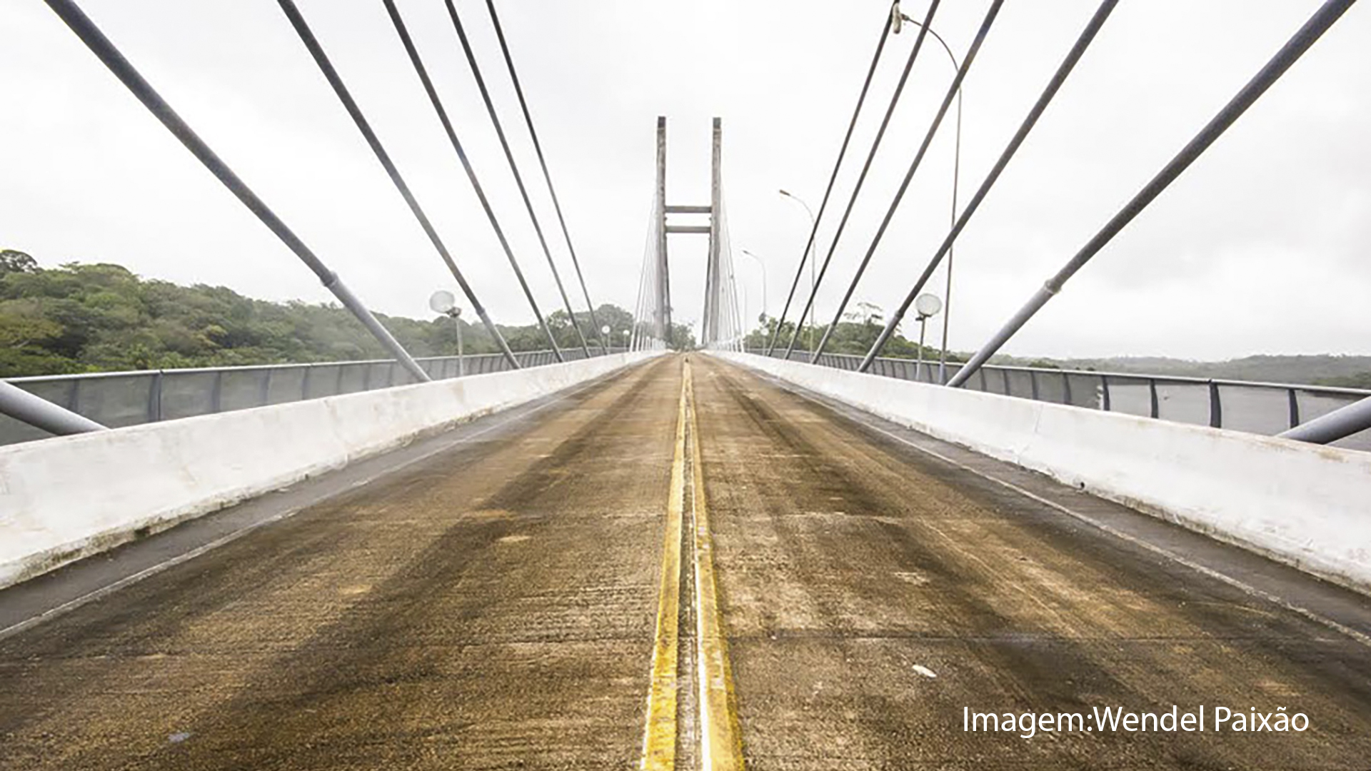 Características Técnicas: A Ponte Internacional do Oiapoque possui um comprimento total de 378 m, sendo composta por um tabuleiro estaiado de 345 m e duas caixas de equilíbrio de 16,50 m. A estrutura conta com dois mastros de 86 m de altura, formando duas torres em forma de “H” até a altura do tabuleiro. A plataforma da ponte tem 13,70 m de largura, incluindo uma seção transversal com um passeio para pedestres de 2,52 m. As fundações da ponte são do tipo Tubulão a Ar Comprimido (Projeto Executivo), feitas de concreto armado com um diâmetro de 2,0 m.