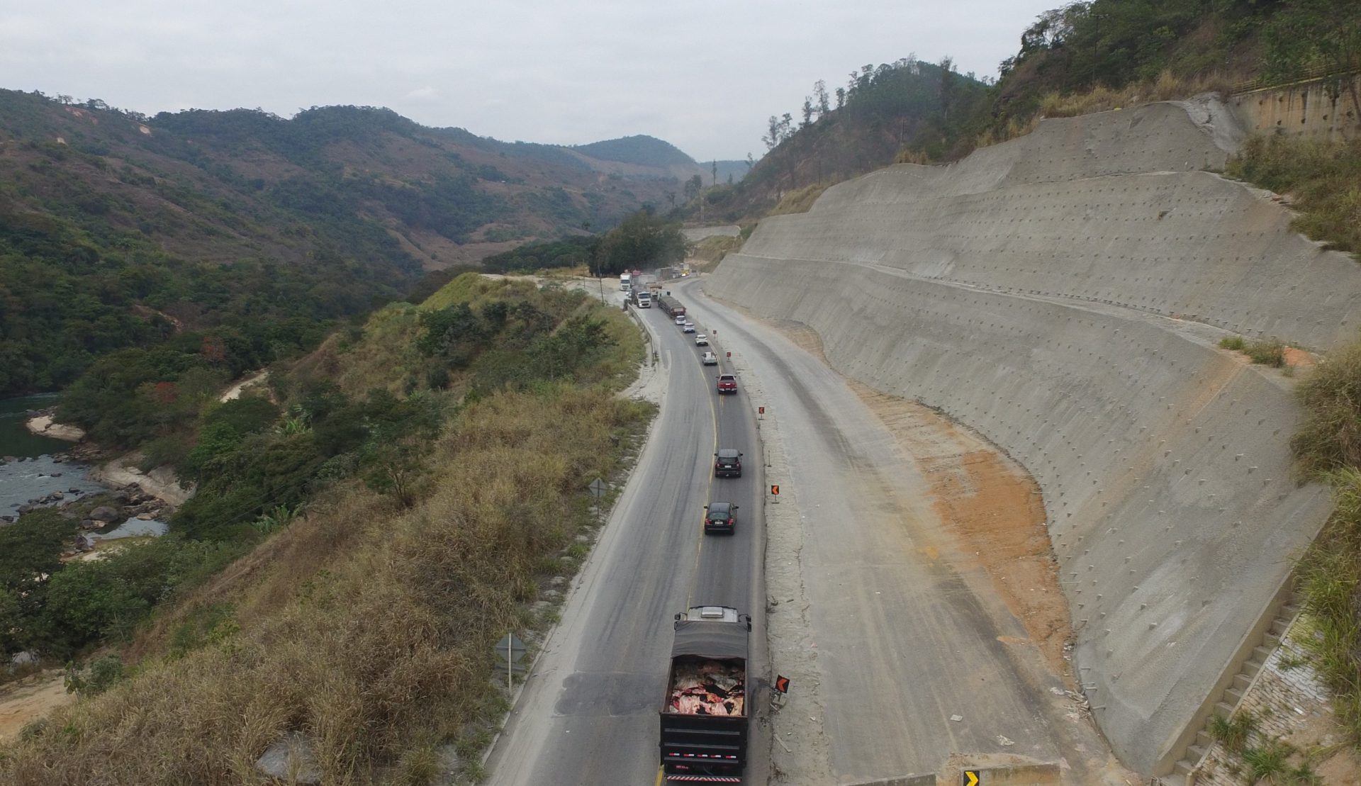Características Técnicas: O lote 3.1 da rodovia BR-381/MG tem classe I-A e uma velocidade diretriz de 80 km/h. O solo predominante da região é do tipo silte arenoso, com inclinações dos taludes de aterro 3h/2v; corte solo 2h/3v; e corte rocha 1h/8v. No segmento entre as estacas 242 a 257 – LD foi implantado solo grampeado. A estrutura do pavimento da pista nova e da pista existente é composta de placa de concreto de 23 cm sobre 10 cm de CCR, assentados em um subleito de 60 cm com CBR mínimo de 10%. O pavimento das alças de acessos e interseções é do tipo flexível, e possuí uma camada de 5,0 cm de CBUQ – borracha, faixa C, 2,0 cm de TSD, 17 cm de CCR e sub-base em BGS com 15,0 cm de espessura, assentados em um subleito de 60 cm com CBR mínimo de 10%. Foram implantadas valetas de proteção, sarjetas em banquetas, sarjetas em plataforma, descidas d’água de corte e aterro em degraus, caixa coletora de sarjeta; dissipadores de energia, dreno longitudinal profundo, colchão drenante para cortes em rocha, bueiros circular e tubular, simples, duplo e triplo. Em relação às OAEs foram implantadas 12 novas obras, entre pontes e viadutos totalizando 2.051,00m de extensão; foram implantados 04 túneis com um total de 2.120m de extensão; 01 passagem inferior de 18,05m e recuperação da ponte sobre o Rio Oncinha de 31m de extensão. As obras complementares constituíram-se de cercas, mata-burros, porteiras, tela antiofuscante, passagens de gado, paradas de ônibus com abrigo de passageiros, calçada de pedestres e barreiras New Jersey. A sinalização horizontal contou com pinturas de faixas, setas, símbolos, zebrados e faixas de pedestres; e a vertical com placas de sinalização com suportes metálicos e poliméricos, delineadores e marcadores de obstáculos. Foram implantados também pórticos, semipórticos e defensas laterais.